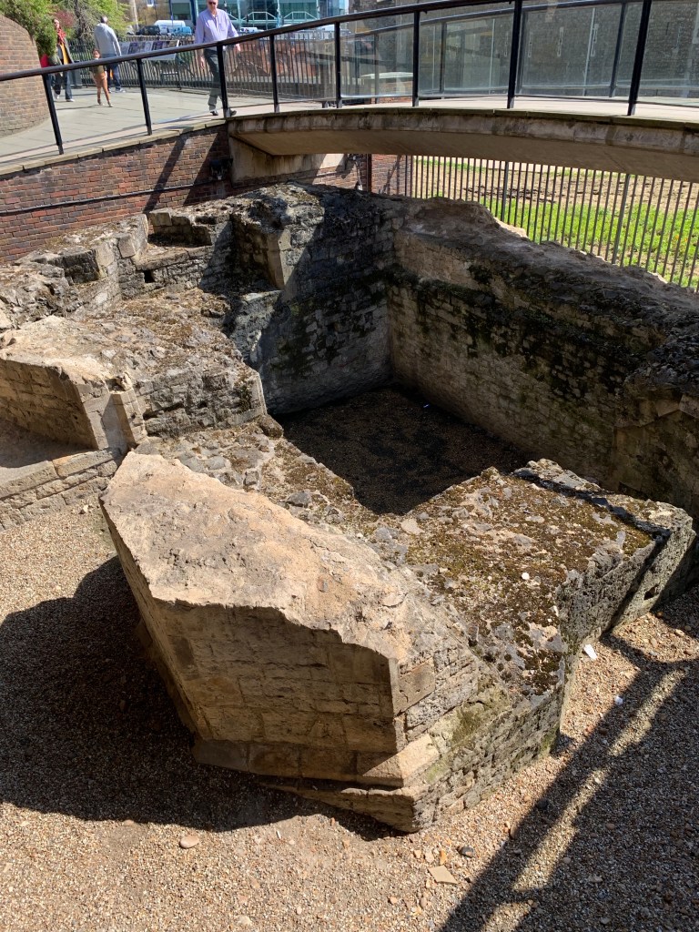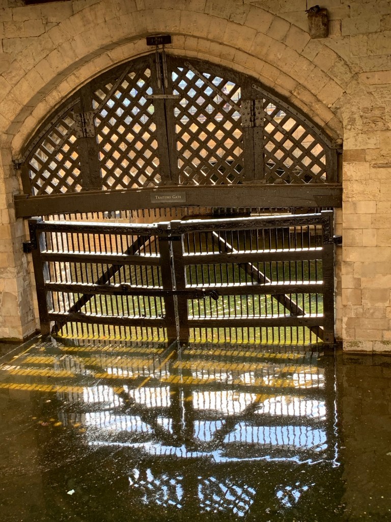 The moat itself is no longer filled with water, and is a deep, grassy field. There are gardens in places, but it just served to remind me of it’s defensive purposes. Across the street from the moat, and in a fenced in area as you come up from the Tube (the underground train system), there was an excavation of stone. The plaquard said it was the old postern gate. It’s just astonishing how old some of these areas are. The Tower of London is over 950 years old! They place the date at 1027 for the White Tower in the center. You can go in many of the towers and you sense the great age. I also took a picture of Traitor’s Gate. Seeing the real thing after I’ve read about it so often, makes some of the horrors (heads on the gate) become real, and it’s terrifying to realize how barbaric we can be as a people