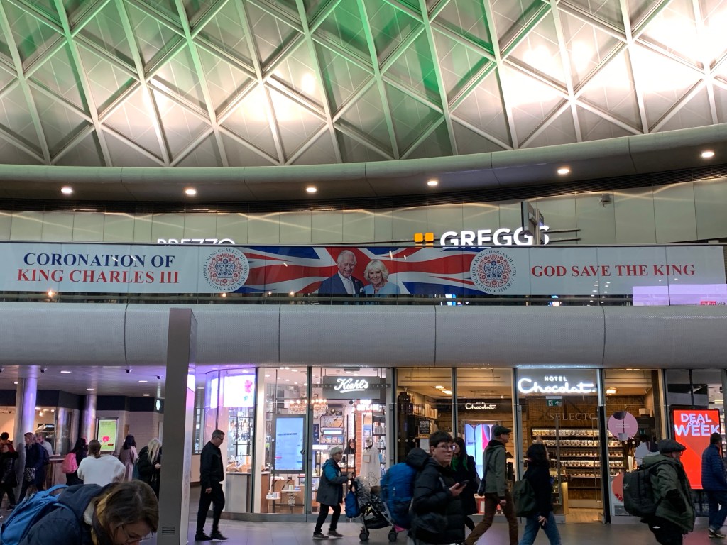 We have discovered that you can get just about anything you need at Kings Cross Station, including a trip to Hogwarts via Platform 9 3/4, except maybe a garbage can. Trash receptical, rubbish bin, not matter what you want to call it – there aren’t any. Security I suppose, but there are benches either, so I’m not really sure what that means. They are however, advertising the coronation with gusto!
