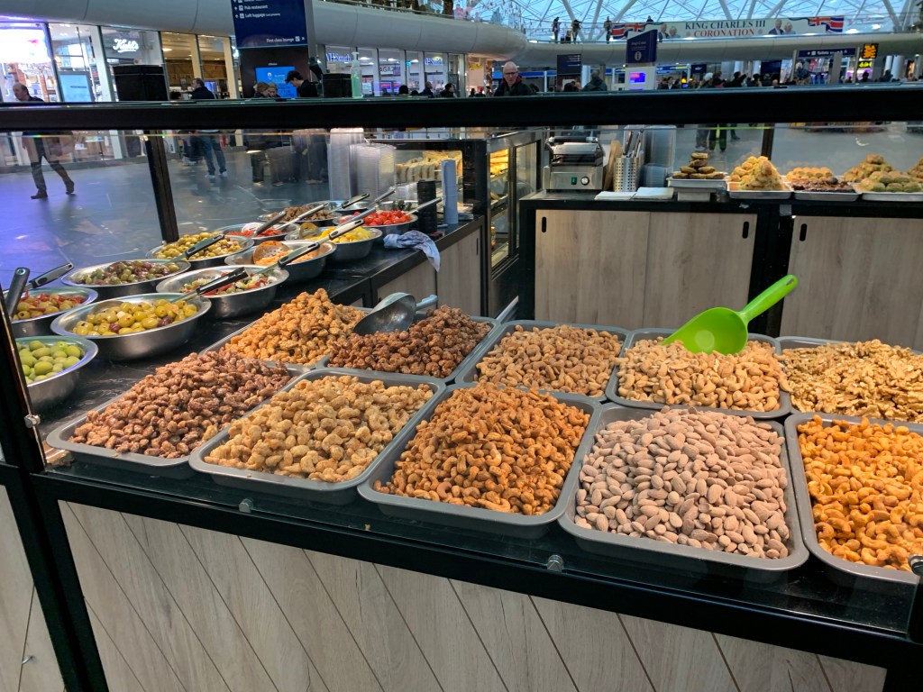 Inside, an open stall offered several kinds of Bacclava, Turkish Delight, nuts and dehydrated chips. I could just eat my way through the train station.