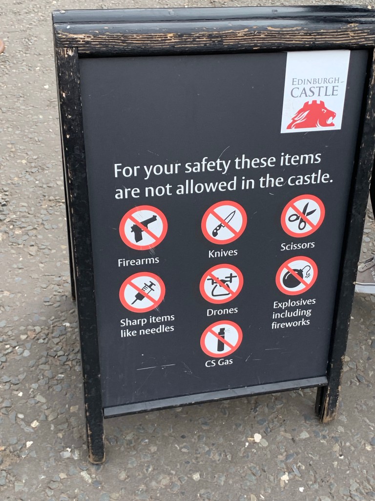 The following two pictures just struck me as amusing. De-icing salt would be a necessity at the castle, and all the items that are not allowed at the castle. I get it, but it’s a fortress! All of these items have been used there at one time or another (except may be drones)!