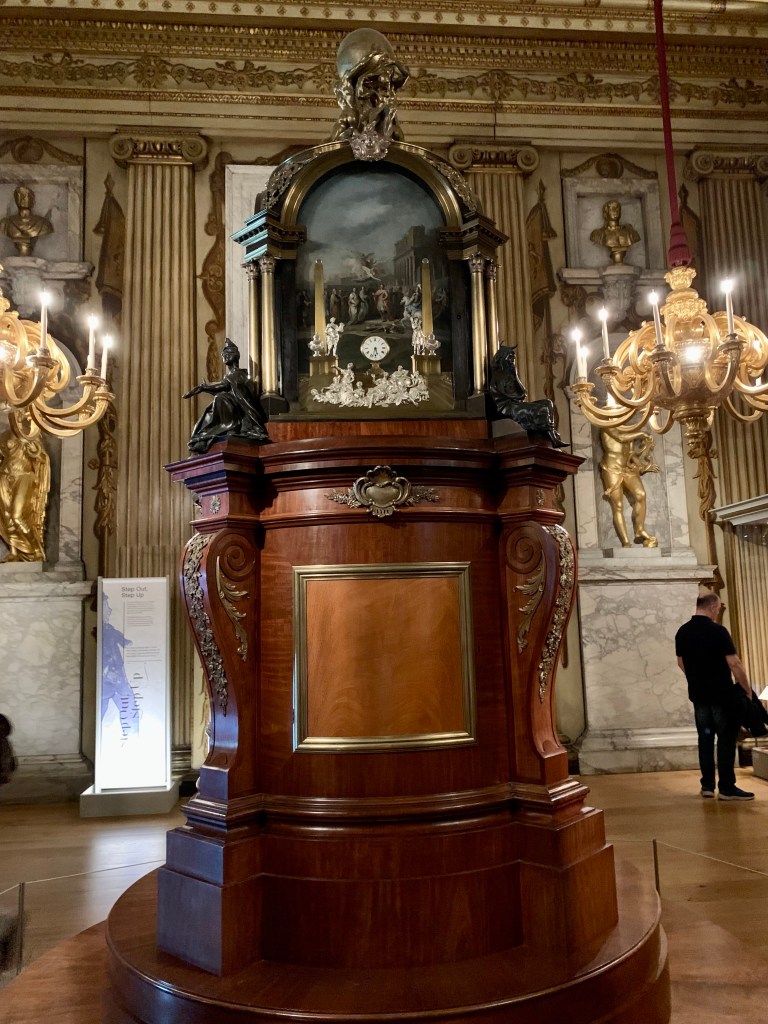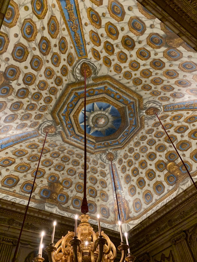 While we were seeing the exhibit, we moved through the rooms of the palace. My favorite was the cupola room. There is a mamoth clock, which also played music. But the ceiling was a masterful piece of artwork. It looks like a dome, but it is an optical illusion. The first three rows of design are on a diagnol, but the remaining is a flat ceiling. I still can’t see it!
